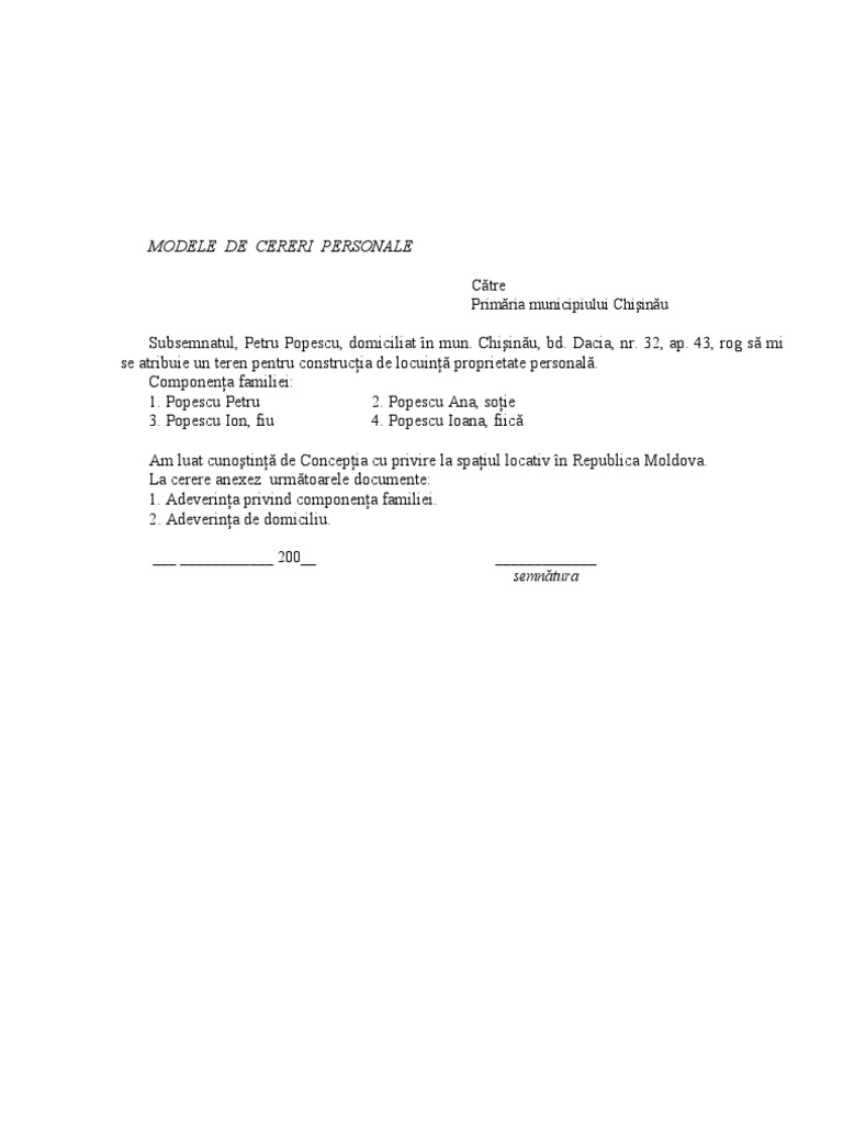 Intrucat fiecare itm elibereaza la cerere registrul pentru evidenta zilierilor, pentru a intra in posesia lui trebuie sa va adresati cu o cerere la acestia. Cerere eliberare carte de identitate. Pentru eliberarea unui titlu de proprietate se parcurg următorii pași: Model cerere tip atribuire titlu de proprietate teren bloc. In afara modelelor de documente modele de cereri: