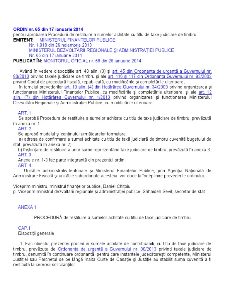 Judiciare de timbru ( în original sau copia certificată de către instanță „pentru conformitatea cu originalul) · documentul de plată al taxei judicare de timbru ( chitanța/ ordin de plată) în original și · împuternicire+ copie c.i. Dacă cel care datorează taxa judiciară de timbru nu are nici domiciliul, nici. 1918/65 din 26 noiembrie 2013, pentru aprobarea procedurii de restituire a sumelor achitate cu titlu de taxe judiciare de timbru, stabilirea sumelor de restituit se face de către instanţa judecătorească, prevăzută la art.