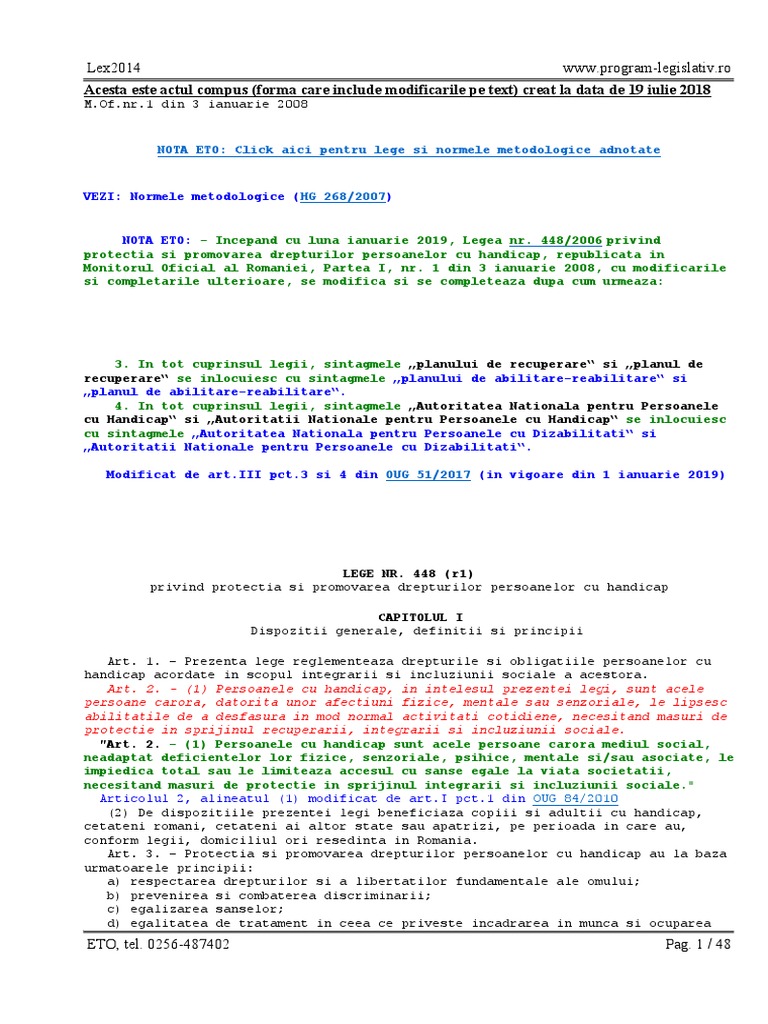Dispoziţii generale, definiţii şi principii 448 din 6 decembrie 2006, republicată*), privind protecția și promovarea drepturilor persoanelor cu handicap (lege actualizată până la 01.02.2018) a. 448/2006 privind protecţia şi promovarea drepturilor persoanelor cu handicap a fost publicată în monitorul oficial al româniei, partea i, nr.