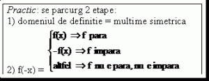 vizitati articolul complet aici : http://www.meditatiionline.ro/44100-24-269-0-0-Formule_Matematica_Functii_Notiunea_de_functie_Definitie.html D r, d r, se numeste periodica de perioada t O functie are simetrii daca este para sau impara, o functie para este simetrica fata axa oy, iar o functie impara este simetrica fata de origine, 4. Oricare ar fi x apartinand domeniului de definitie, opusul său la fel aparține domeniului de definiție: